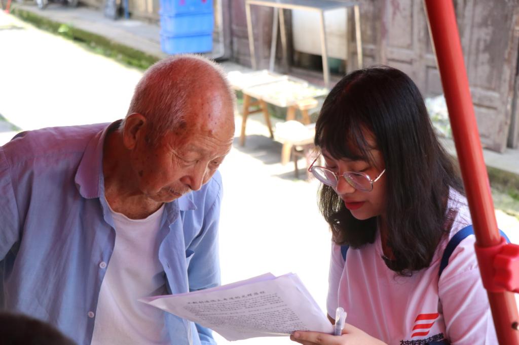 太阳蒸发了树木枝叶上的水汽,却丝毫没有蒸发掉志愿者们的兴致。他们顶着烈日,沿古街走访并向当地居民发放关于对“新中国建立70周年”的调查问卷及理论宣讲。志愿者与涞滩镇居民交流询问,居民们都热情参与配合调研,通过阅读宣讲资料,新中国成立70周年以来的变化在居民脑海中变得更加立体化了。古镇中多为年纪较大的爷爷奶奶,他们是完完整整见证了新中国成立70年发生的翻天覆地变化的那代人,每当志愿者提到中国发生的改变,他们都神色激动,由衷地夸赞了国家发展的进步、社会生活的安定、医疗保障的普及和教育水平的提高。“以前和现在比,差得太远了”、“现在的政策好啊!”这些质朴的回答以及他们谈及这些话题时的盈盈笑脸,让这个烈日炎炎的下午变得意义非凡。