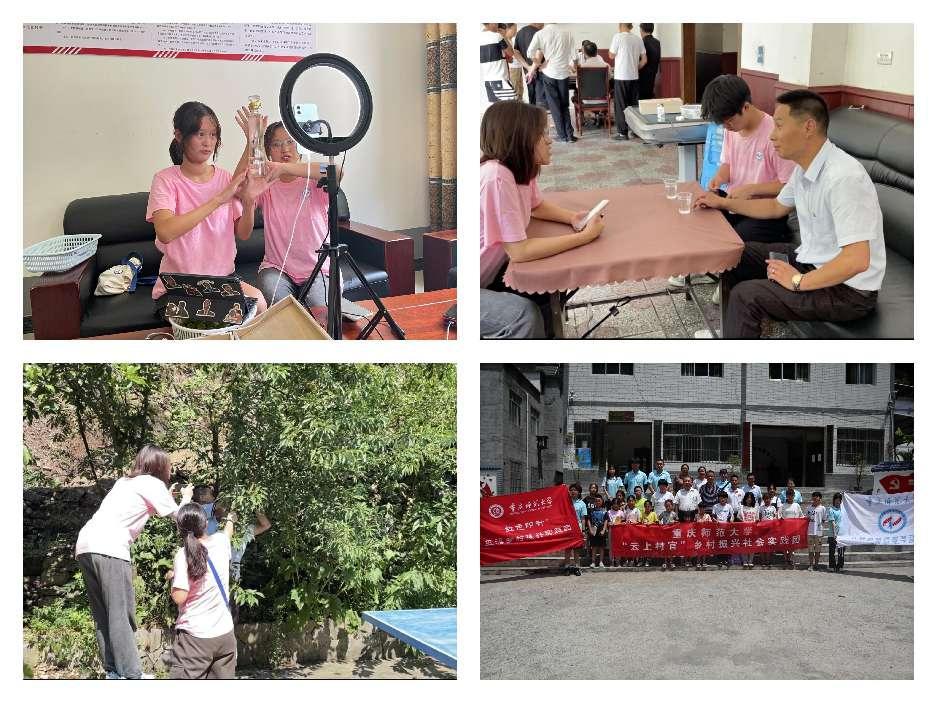 实践团成员进行走访调研,结合对当地特色产业已有的了解,利用自身所学知识和社会实践经验确定了初步宣传方案,并分别与带队老师胡绍宇、M88驻岔路村第一书记罗世祥对宣传方案进行商讨,最终确定了通过情景剧的形式来展现当地李子酒、瓜蒌酒的特色。当天下午,成员们前往徐家镇实践所,进行拍摄的前期工作准备,进行分组行动,一组成员与罗书记前往李子园进行拍摄场地的取景,另一组电商成员与岔路村书记鲁昌喜沟通后续拍摄的细节,对拍摄内容、时间、人员进行安排。7月12日,电商组与文化组共同确认参演情景剧的部分人员,在鲁书记的帮助下顺利地完成各个镜头的拍摄工作。同时,团队成员结合当下网络直播的热潮,利用直播科技助农,介绍当地特色农产品,拓宽产品的宣传渠道,以实际行动促进乡村振兴,提升乡村振兴宣传效能。