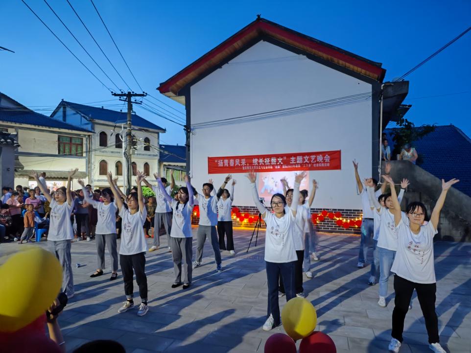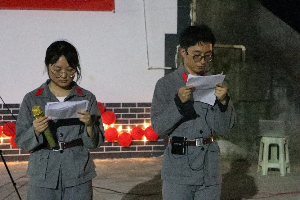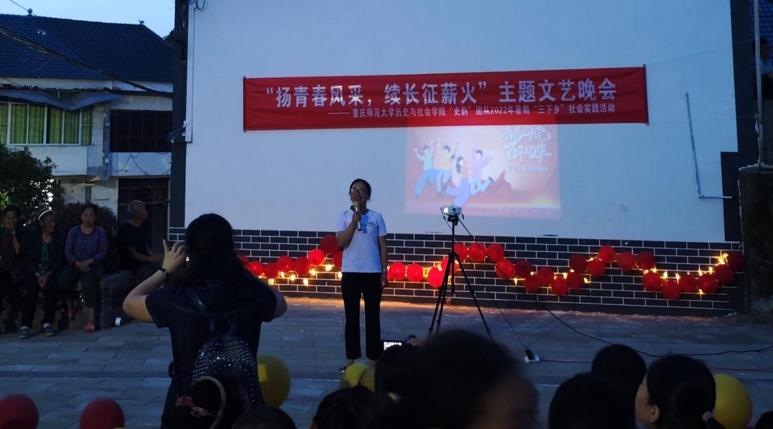 “史韵”团队于当天晚上20点准时开展“扬青春光采,扬长征薪火”主题晚会活动,邀请了重师校友、綦江区文化旅游委党委委员、副主任、綦江博物馆馆长、研究馆员周铃,綦江区委党史地方志研究室主任陈平,重师校友、綦江区安稳镇宣传统战委员夏娟,羊角村党总支书记何康,华龙网记者等相关专家领导以及羊角村的村民们共同参与此次活动。晚会由王骏杰、钱丹缇主持。