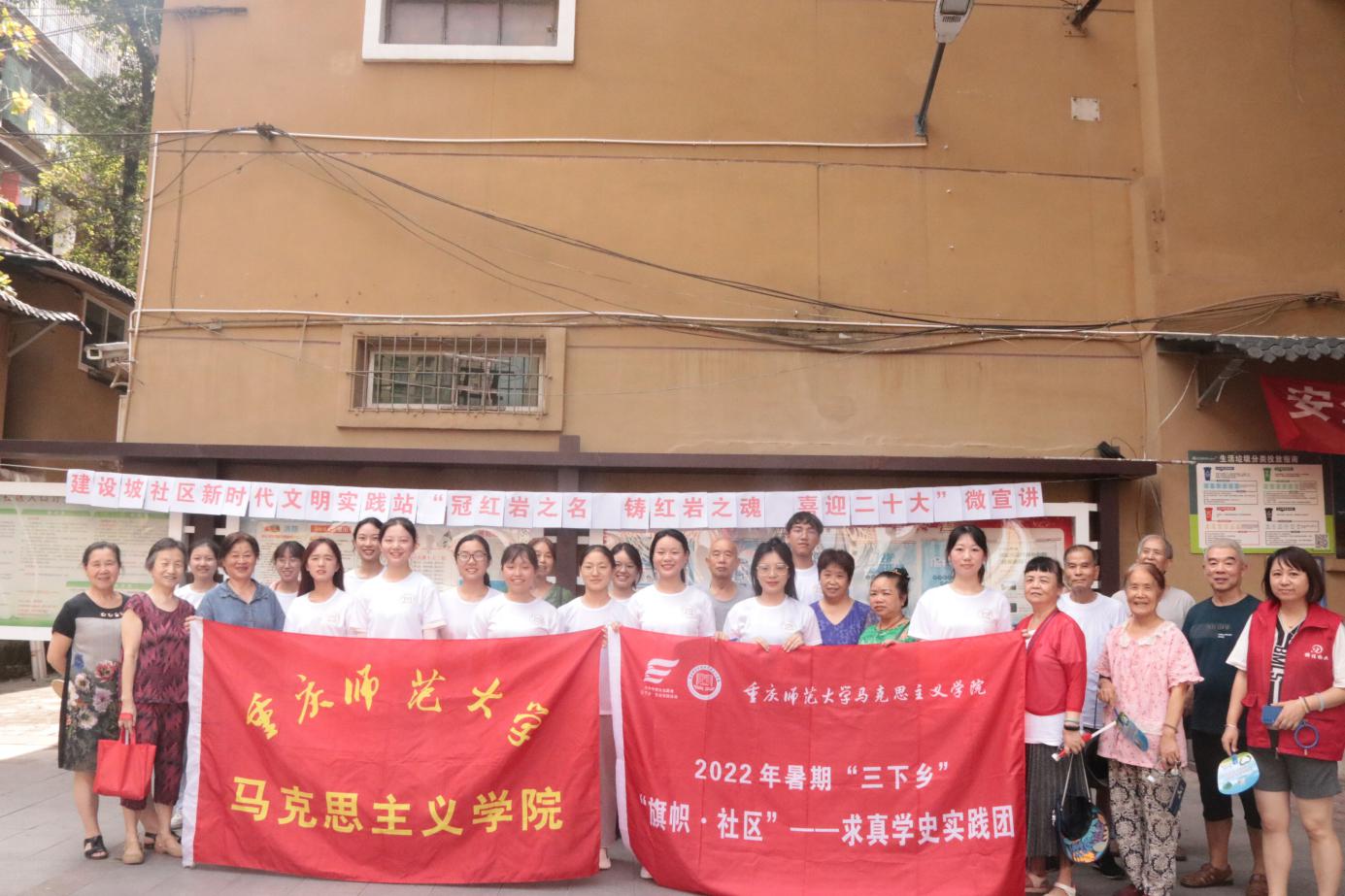 为深入学习习近平总书记在党史学习教育动员大会上的讲话,将奋斗拼搏、不忘历史的光荣传统与实践活动相结合,2022年7月15日下午,M88马克思主义学院“旗帜·社区”—求真学史实践团在带队老师的带领下,前往重庆市沙坪坝区石井坡街道建设坡社区开展党史学习教育宣讲实践活动。