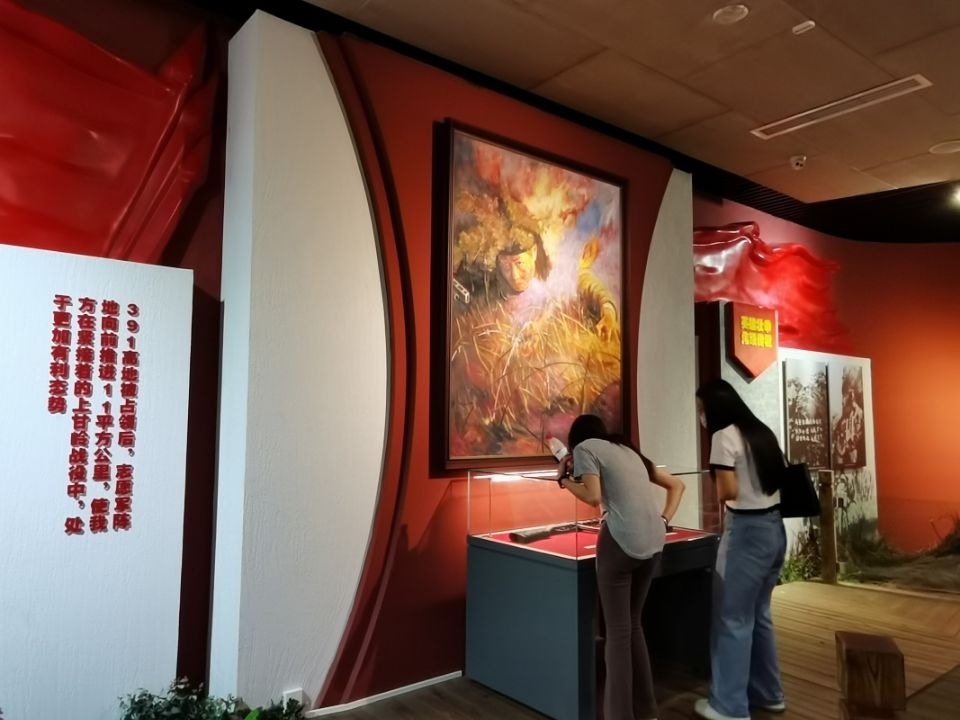 往上走来到二楼,二楼的房间是介绍的是邱少云烈士入朝参战、保家卫国,跨过鸭绿江,参加伟大的抗美援朝的战争的相关经历。在这个房间里有抗美援朝初期双方重武器装备对比表,有大量枪支的模型,配上铁血军魂,战火铸就这八个字,还有一个模拟的战争环境,展示了邱少云训练用过的木制手榴弹、1951年邱少云参加抗美援产战争时期戴的帽子,1950年邱少云参加抗美援朝穿的军装。团队成员们逐一览过,仿佛透过橱窗看见了邱少云烈士举起手中的武器冲向纷飞的战火。
