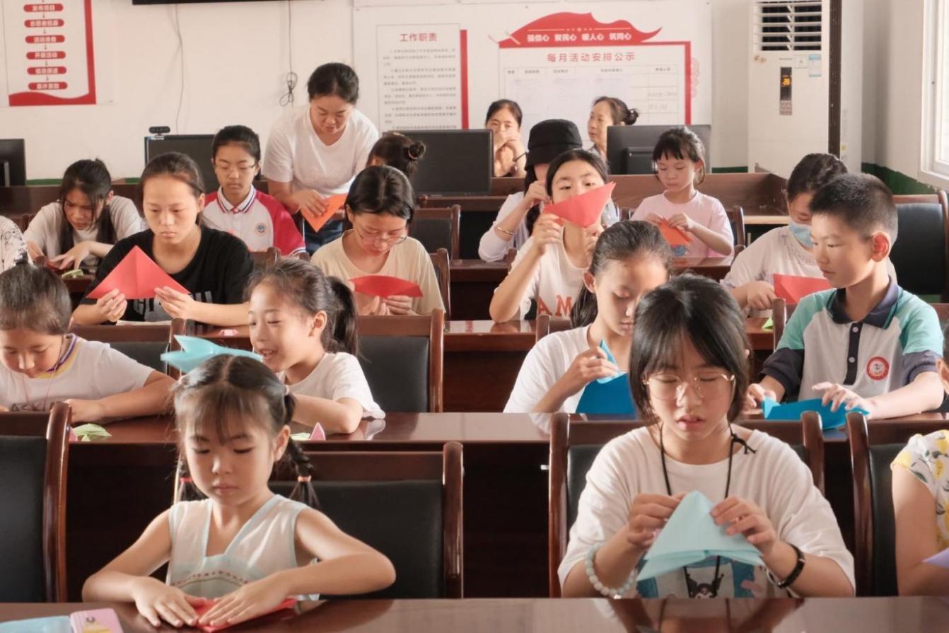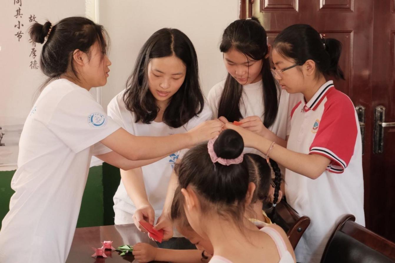 (图为志愿者帮助学生折纸)
