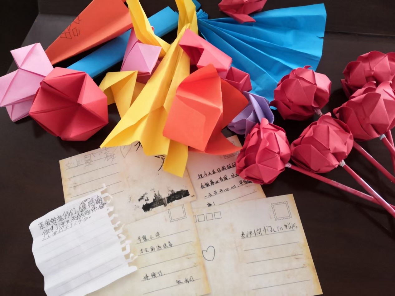 以信寄托思念,用字打开心扉。孩子们挑选喜欢的明信片,用稚嫩的双手书写深藏在内心深处平时想说却未说出口的话语,将最真诚、最质朴的情感通过信件传递给他们在外奔波的父母,或辛苦工作的老师。这些直白的话语往往最直击心灵,虽没有华丽的辞藻,却是最动听的“情话”。活动结束之际,团队成员们也收到了孩子们的手工作品和明信片,孩子用他们的方式表达着对实践团成员的感谢。通过此次怦然“信”动明信片活动,让孩子们学会勇敢表达内心的言语,大胆吐露内心的情感;同时也让团队成员感受到了孩子们的纯真懂事,加深了内心深处对师范生的身份的认同感,坚定了投身祖国教育事业的决心。