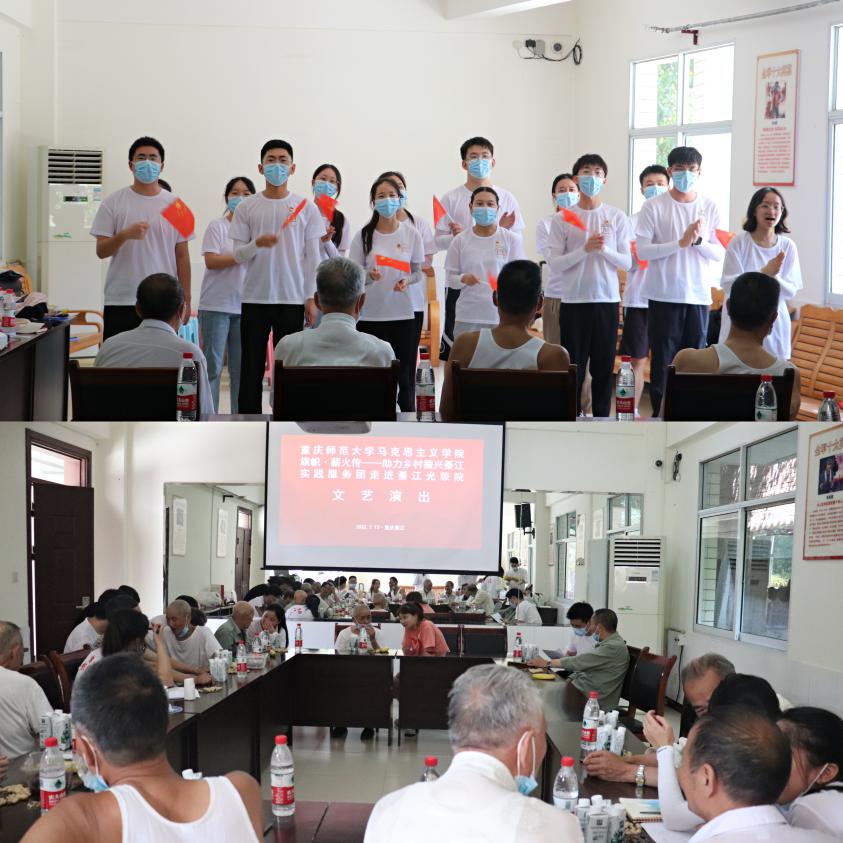 下午3点,实践团前往綦江区光荣院,举办文艺汇演,慰问退伍老人,采访革命故事。