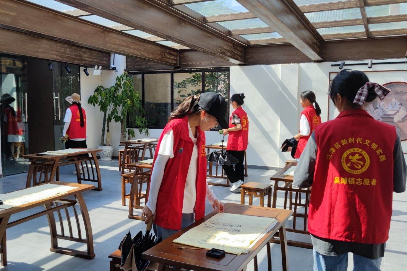 离开实践站,志愿者团队走进了冲口私塾教室。冲口私塾是聂荣臻元帅曾学习过的地方。一副先师孔子行教像挂在案桌中央,“仁义礼智信,温良恭俭让”正是为师之道。展馆内陈放了一排排颇具古雅的木质桌椅,是练习毛笔字的地方。在学习了毛笔字的写作方式,实际体验了毛笔的书写后,实践队员不禁感慨毛笔字的藏蕴含蓄。