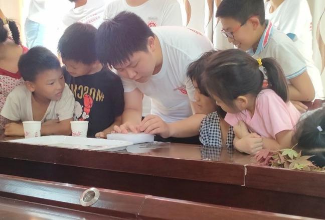 猎猎红旗,迎风舞动。7月9日下午,服务团来到万隆村便民服务中心,面向当地少年儿童开展“康养”志愿服务活动。“养智”是“康养”服务的重要内涵,服务团志愿者通过开展特色科普活动,培养山区青少年的科学素养,传播生态文明理念,促进农村科技教育资源均衡发展,助力当地乡村振兴。