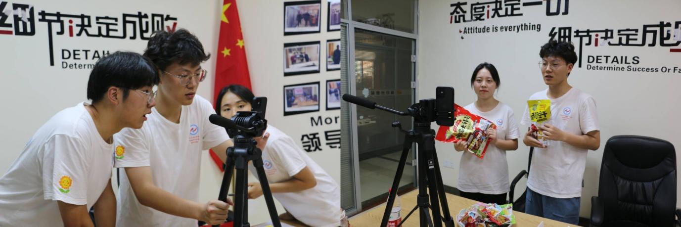 下午,电商组的同学们围绕当地特色农副产品,开展助农直播,用相机镜头对准生产车间,将鸣玉镇的特色农副产品带入直播间,将当地特色金光菜籽油、味轩州豆干通过直播的形式推向大众。