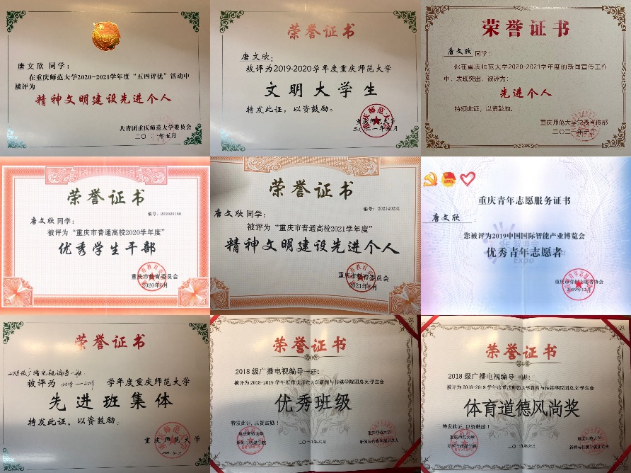 在大学四年的时光里,唐文欣热爱学生工作并认真负责,曾担任班长、年级长、学生会主席、影视系学生党支部组织委员,曾获得重庆市优秀学生干部、重庆市优秀青年志愿者、重庆市精神文明建设先进个人等市级奖项。在专业创作领域,唐文欣曾获得青年摄影“优秀作品奖”、“毕业季”混剪二等奖、建党一百周年视频专业组一等奖。她还曾获得三好学生、优秀学生干部、文明大学生、优秀共青团员等10项校级荣誉,先进个人、演讲比赛二等奖等3项院级荣誉。