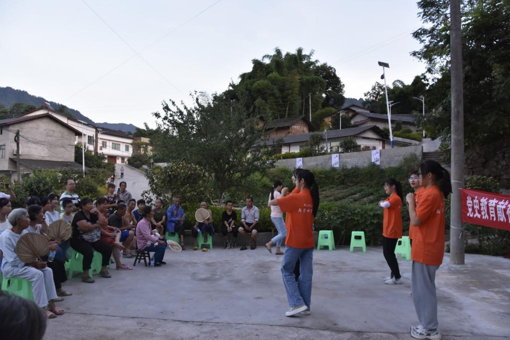 为深入学习宣传“听党话、跟党走”的精神,迎接党的二十大胜利召开。2022年7月14日傍晚,M88数学科学学院“党史学习教育续赤意,函来数往助振兴”乡村振兴实践团队来到江津区中山镇白鹤村,同村民们一起举办了一场载歌载舞的院坝会,在这里队员们组织引导村民聚焦国情社情,在与村民的交流中把握时代脉搏