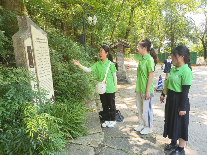 自雄壮的大门而入,走到蜿蜒小道的尽头,抗战遗址群落便跃然眼前。一座座坚挺的石碑书写着抗战时期的历史,讲述着重庆在曾经艰苦岁月里的种种血雨腥风。团队成员在主讲人的带领下对介绍碑一一解读,认真了解抗战遗址群落的由来及其承载的历史,体悟抗战军民的坚定信仰和不怕牺牲的精神。