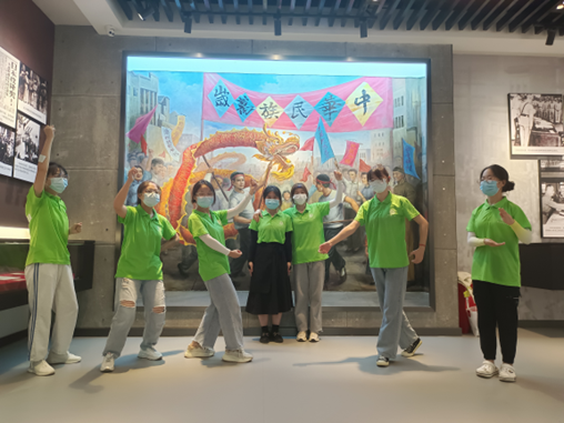 经过14年艰苦卓绝的战斗,中华民族迎来了抗战胜利。在展厅的最后一部分,有一面巨大的彩绘壁画,名叫“中华民族万岁图”,刻画了抗战胜利时全民族人民的快乐。整幅画作以暖色系为主,画作的中心是一位母亲带着孩子在街道上观看青年男子舞动龙灯,他们在花团锦簇中笑容灿烂,身后彩旗飘舞。图上人民脸上的喜悦和期盼深深感染了团队中的所有成员,成员们不由自主地仿照图上的场景,新时代青年生逢盛世的感慨也油然而生。