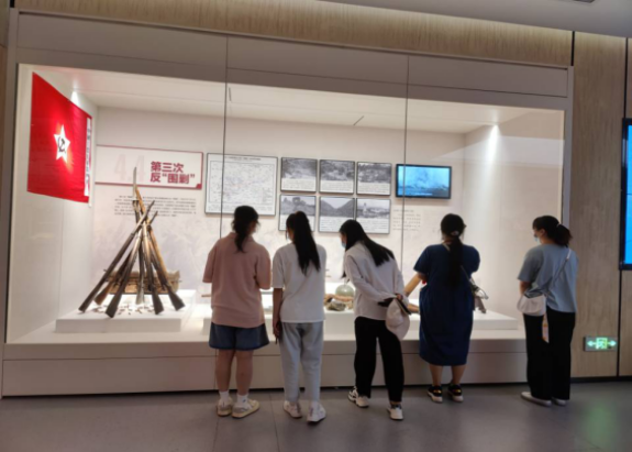 除了图文介绍,纪念馆内还陈列了红军使用的武器、军旗、军装等实物,这些武器尽管锈迹斑斑,但是锋芒不减,大刀上面留有血槽,重型机关枪庞大而厚重,迫击炮和炮弹依然给人压迫感。寻访团近距离观察这些历经战火的武器,心潮既澎湃又沉重。寻访团成员黄诗原感慨:“以前只觉得这些武器非常酷,但是今天在馆内现场观察、近距离接触之后,只觉得战争可怖无情,而我们所拥有的美好,都是先烈们用鲜血与生命换来的。”此外,寻访团成员还在馆内体验了采用多媒体艺术景箱、幻影成像等技术设置的“我要当红军”和“艰苦奋斗渡难关”等互动模式,更深度地对王良的政治品格和奋斗精神进行了学习。