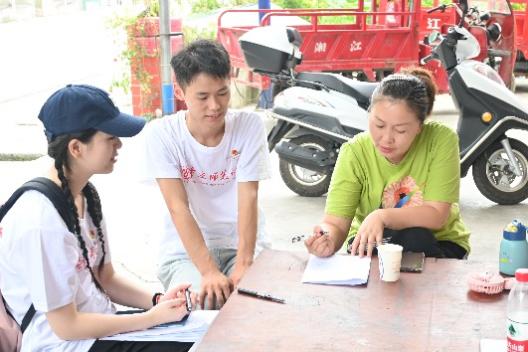 图为成员们与村民交流并协助填写调查问卷