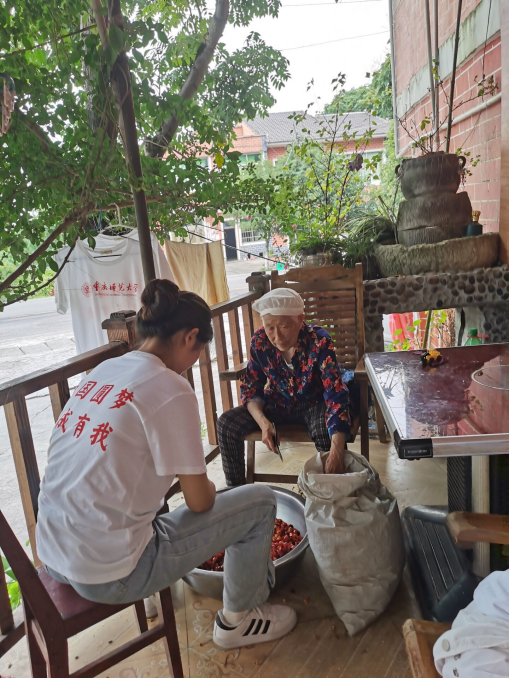 为同学在帮村民一起剪糊辣壳 带队孙老师在红色人家下厨准备晚餐