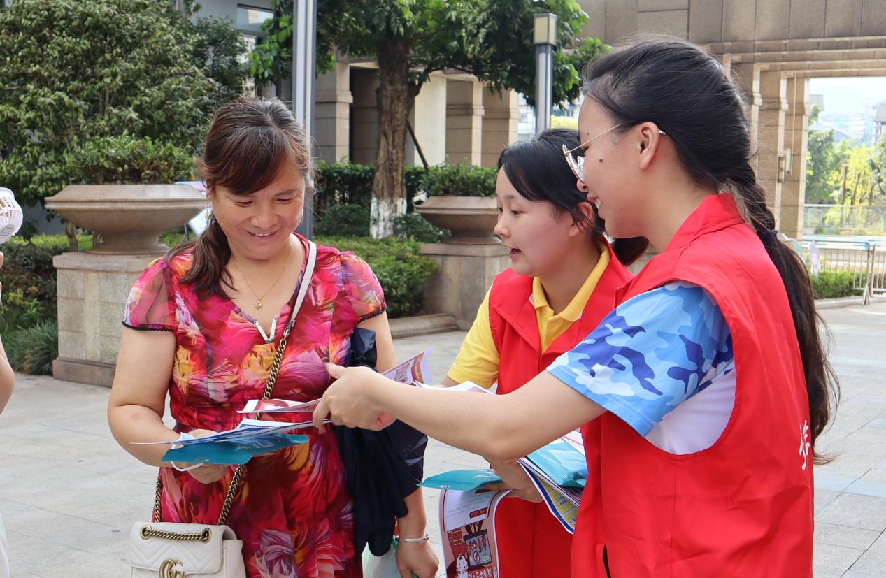 (图为志愿者为当地居民分发防洪防汛传单。中国青年网通讯员 姚雨婷 摄)