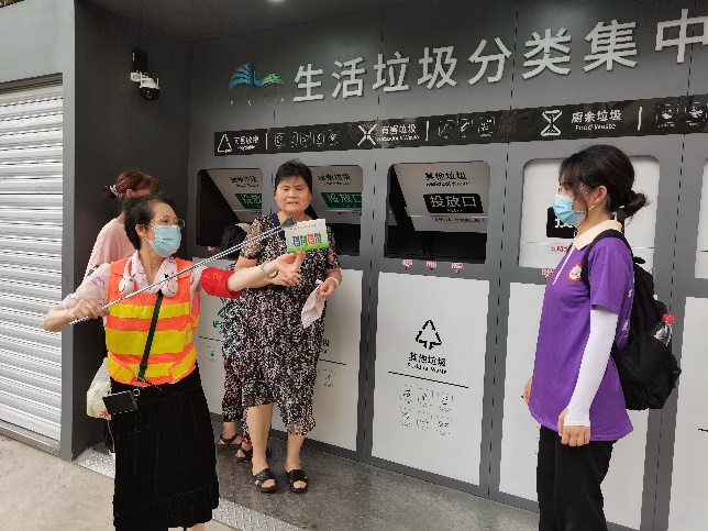 (志愿者们协助基层工作者督查垃圾分类工作)