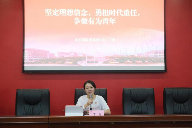最后,美术学院副党委书记丁睿老师开展了“坚定理想信念,勇担时代重任,争做有为青年”的专题党课。丁睿书记以青年党员党性修养为出发点,以三下乡社会实践服务为切入点,以学生干部队伍的责任与担当为着力点,给同学们上了一次生动的党课。丁睿书记呼吁美院学子积极投身于社会服务和学院建设,在社会实践中引领学生立志做有理想、敢担当、能吃苦、肯奋斗的新时代好青年。