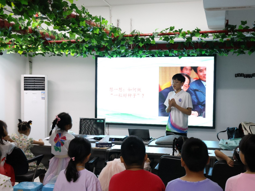 当日上午九点,实践队来到了康居西城第一社区,活动第一个环节是优秀人物分享会。袁隆平是我国当代杰出的农业科学家,也是享誉世界的“杂交水稻之父”。志愿者带领小朋友学习优秀人物袁隆平院士的先进个人故事,为小朋友讲诉袁隆平院士的“时代楷模”精神。在活动过程中小朋友就如何做“一颗好种子”进行深思,与实践队志愿者进行沟通交流。有的小明友提出了要好好吃饭、长大后报效国家。课堂上,志愿者们说:“现如今,我们已经不再为能否吃饱饭而担忧了,袁隆平院及其背后默默付出的团队功不可没。”
