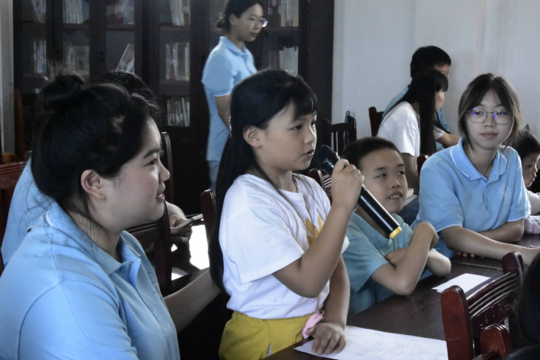 图为实践成员带领小朋友回答问题