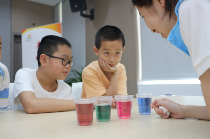 (图3 志愿者带领小朋友做“海底熔岩爆发”和“神奇魔法水”小实验)