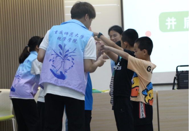下午的趣味运动会包括成语接龙、螃蟹运球、化学元素砰砰砰、两人三足、手脚并用、并肩前行和童声欢唱等七个环节。团队成员有条不紊地带领小朋友们参与游戏,同时推出了集“小红旗”贴纸兑换奖品的活动,激发了孩子们的积极性,让他们享受到团队协作带来的满足感。最后,小朋友们拿着填充神奇魔法水——紫甘蓝遇酸碱变色的漂流瓶挂饰与团队成员合影留念。