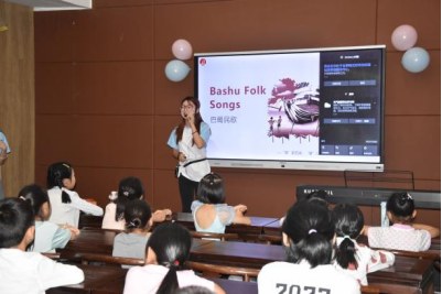 "Work hard, heizuo heizuo heizuo..."课堂围绕巴蜀民谣和长江号子、双语讲巴蜀民歌民俗有序展开。服务团老师以一首流脍人口的巴蜀民歌《竹枝词》引入,又进一步带大家用双语吟诵民歌《春夜喜雨》Happy Rain on a Spring Night,领会民歌韵律之美以及双语学习的乐趣。为活跃课堂气氛,老师与团队成员共同演绎川江号子小短剧,引领大家一起以倾情还原船夫们卖力的嘶吼声的方式喊出了英文版的长江号子。本次课堂包含多样的趣味小游戏,让小朋友们分组配合,一起接龙读卡片、玩侦探间谍游戏、唱英文童歌,既加深了大家对所学英语短语的记忆,也激发了他们独立探索学习双语讲好巴蜀故事的兴趣。