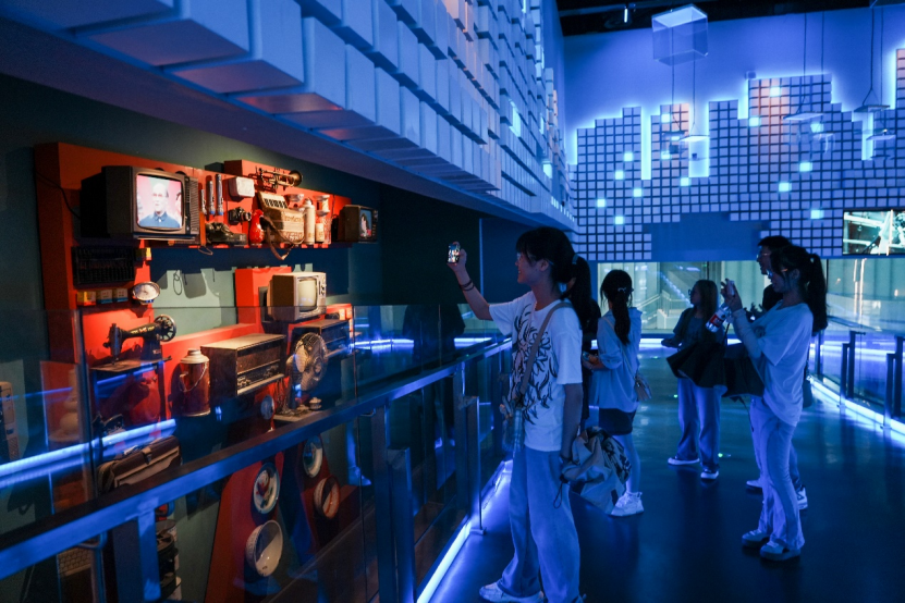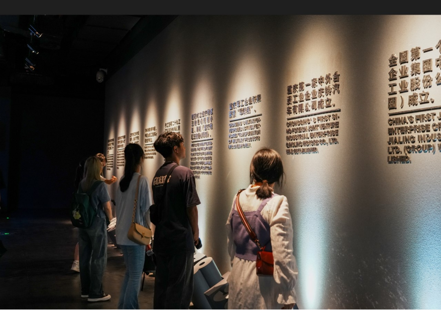 团队一行人乘坐地铁来到重庆大渡口工业博物馆。映入眼帘的,是整个博物馆最恢弘的建筑——主展馆。主展馆内有从抗日战争时期以来工业发展的成果展示,以及生产场景复原。跟随指示牌的指引,同学们看见了重庆手工业第一家火柴场生产的火柴盒,看见了汽车业从无到有的巨大变革……越往里走,现代化气息越发浓厚,终于,小分队走进了改革开放时期的展品陈列室。展馆内有音乐播放,寻觅源头,队员们看见了满墙的收音机与电视机,它们来自不同的年代,现在鲜明地展现在了大家的眼前,同学们不约而同地发出阵阵赞叹。