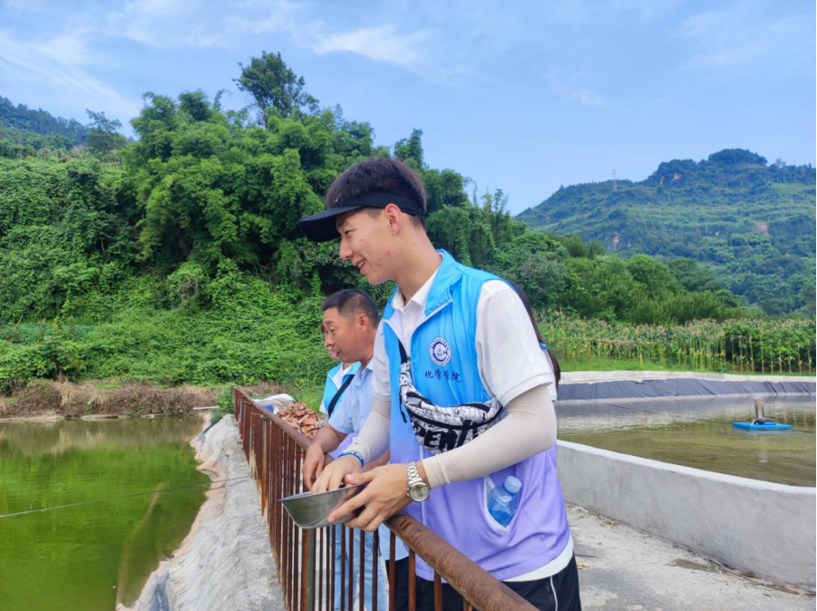 一路调研,来到了当地一位鱼类养殖户家,且主要以养殖鲈鱼为主。在老乡的热情介绍之下,实践团了解到了鱼类的鱼苗购买、养殖过程,销售渠道等过程。养殖户介绍到:“夏天的鱼苗生长得会更快,数量会更多,会极好地促进水产业的发展。”在调研中,实践团成员不仅认识到鱼苗对于渔业资源的重要性,还在鱼苗饲养过程中意识到先进的养殖技术对于促进养殖产业生产发展有着决定性因素。在了解中,实践团成员还询问老乡养殖水产品的相关问题,对于水面上大片水华的处理,以及增氧设备的作用与意义。老乡一一解答,甚至主动与实践团成员讲解养殖业的专业知识和相关难题,并让实践团成员亲身体验饲养鱼苗的过程,收获颇多。