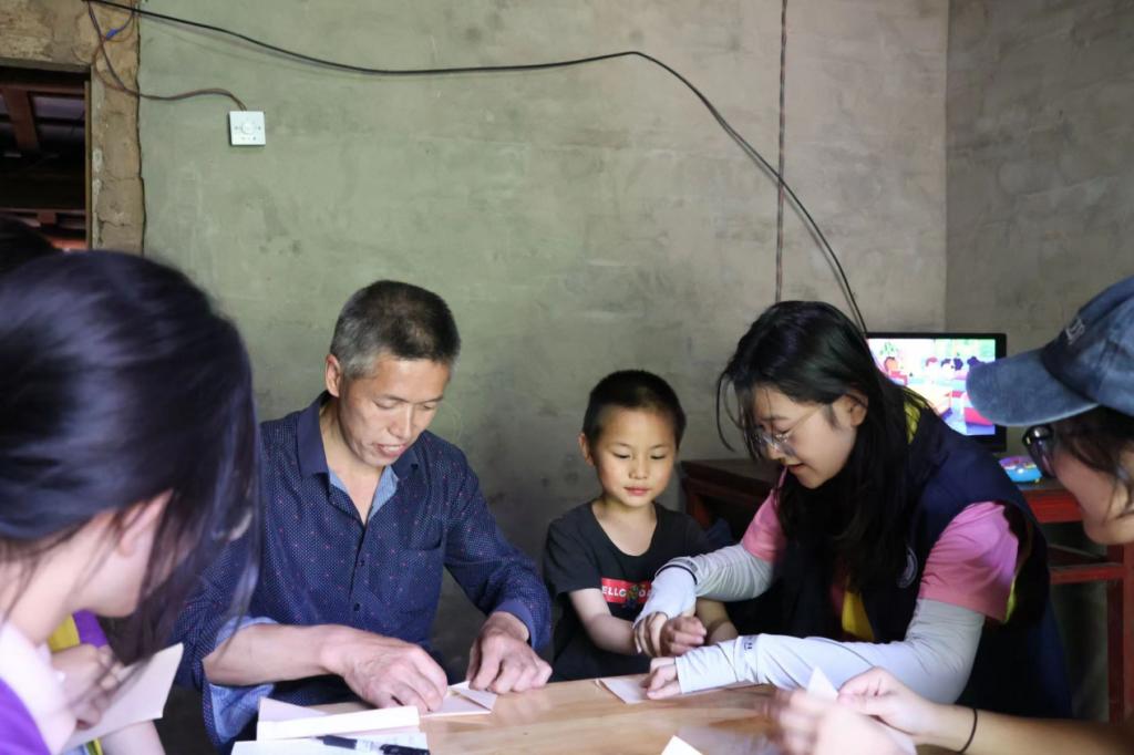 (图为实践团成员与张铁舰及其父亲折纸 摄|刘思宇)