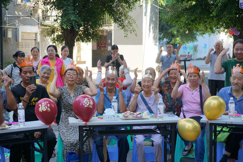 炎炎夏日,只见个个黄色身影穿梭在菜坝街头,扛起物资、亮起歌喉、挺起胸膛、挥起双臂,“史韵”基层治理团的成员们精心筹划、紧张排练,身体力行托起幸福“夕阳”光景,以求达到“为老”服务的最大效能。活动当天,色彩缤纷的气球随微风晃动,爷爷奶奶们正在团队志愿者们的引导下至生日祝寿KT板前合影留念,为他们留下弥足珍贵的回忆。“咔嚓”相机快门轻响,一张张受着岁月洗礼的面庞腼腆含羞或自信昂扬,彩色影像里体现着最蓬勃、最具生命力的老年画像。