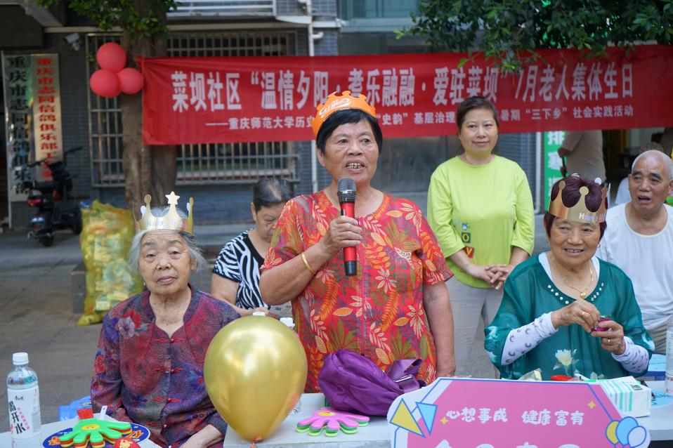 生日会开始,菜坝社区党委书记刘世群致辞。她首先对重师“史韵”基层治理团的到来表示欢迎和衷心地感谢,随后亲切问候到场的所有寿星老人与其他街坊邻里。孝意绵绵献舞曲,暖心欢愉常相伴。团队成员郭崇前、冉曼现场带领爷爷奶奶们拍拍头、拍拍肩做起了《拍拍操》,帮助他们舒展筋骨,愉悦身心。爷爷奶奶们跟着生动有趣的节奏,伸出双手进行互动,场面一度打得火热。“我们在这里欢聚一堂,共度生日,是要感谢党、感谢社区对老年人的关怀关爱。以前哪有机会过生日?现在能参加社区组织的老人集体生日会,我心里既高兴又激动!”寿星刘奶奶感慨道。