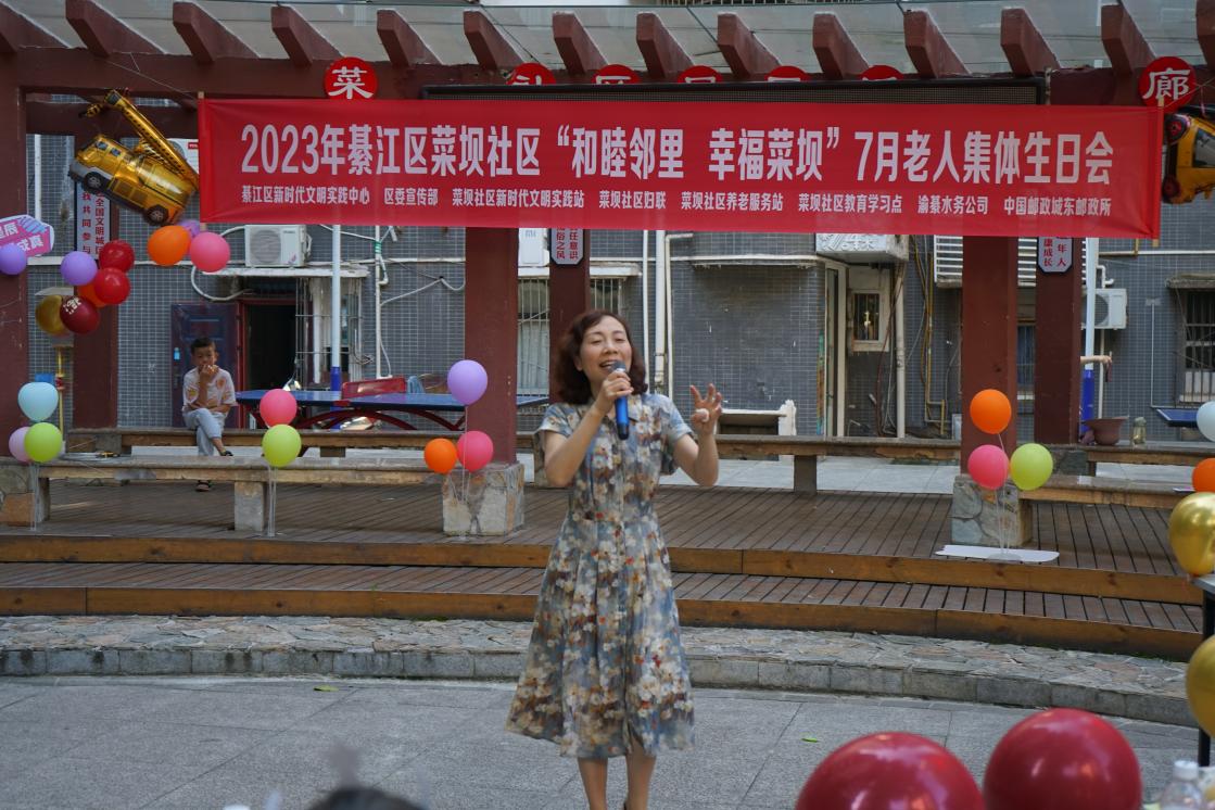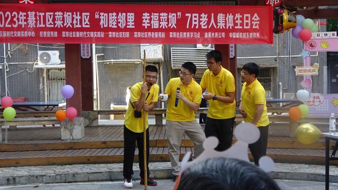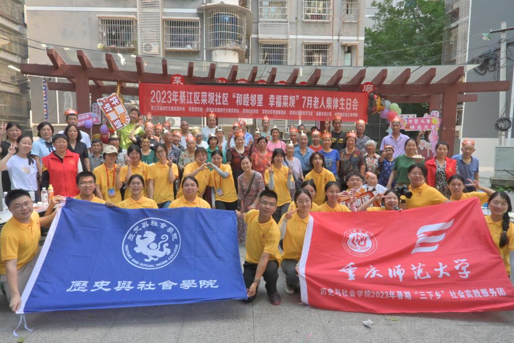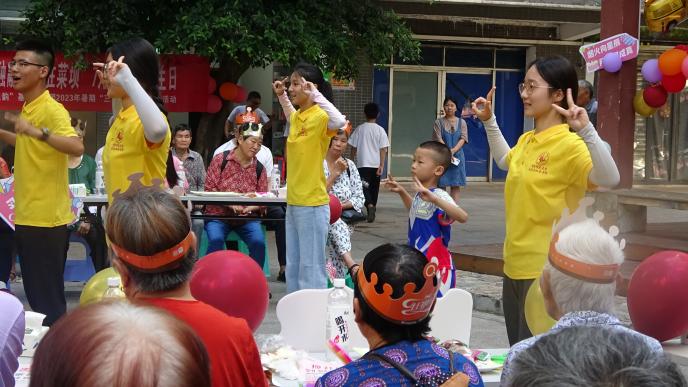 “今天你生日,送上我祝福,特别的日子有灿烂的笑容……”一大早,菜坝社区居委会院坝就传来欢快的音乐声,这是正在举办社区7月老人集体生日会。为进一步弘扬中华民族尊老、爱老、敬老的传统美德,丰富老年人精神文化生活,增强老年人的幸福感,7月17日,M88历史与社会学院“史韵”基层治理团在指导老师赵丹的带领下前往綦江区文龙街道菜坝社区,为社区7月过生日的老人们举办了一场主题为“和睦邻里,幸福菜坝”的集体生日会。