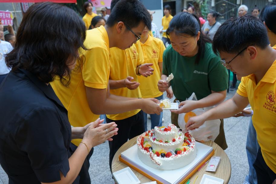 (图为社区工作人员与团队成员为寿星们切蛋糕 王仁杰摄)
