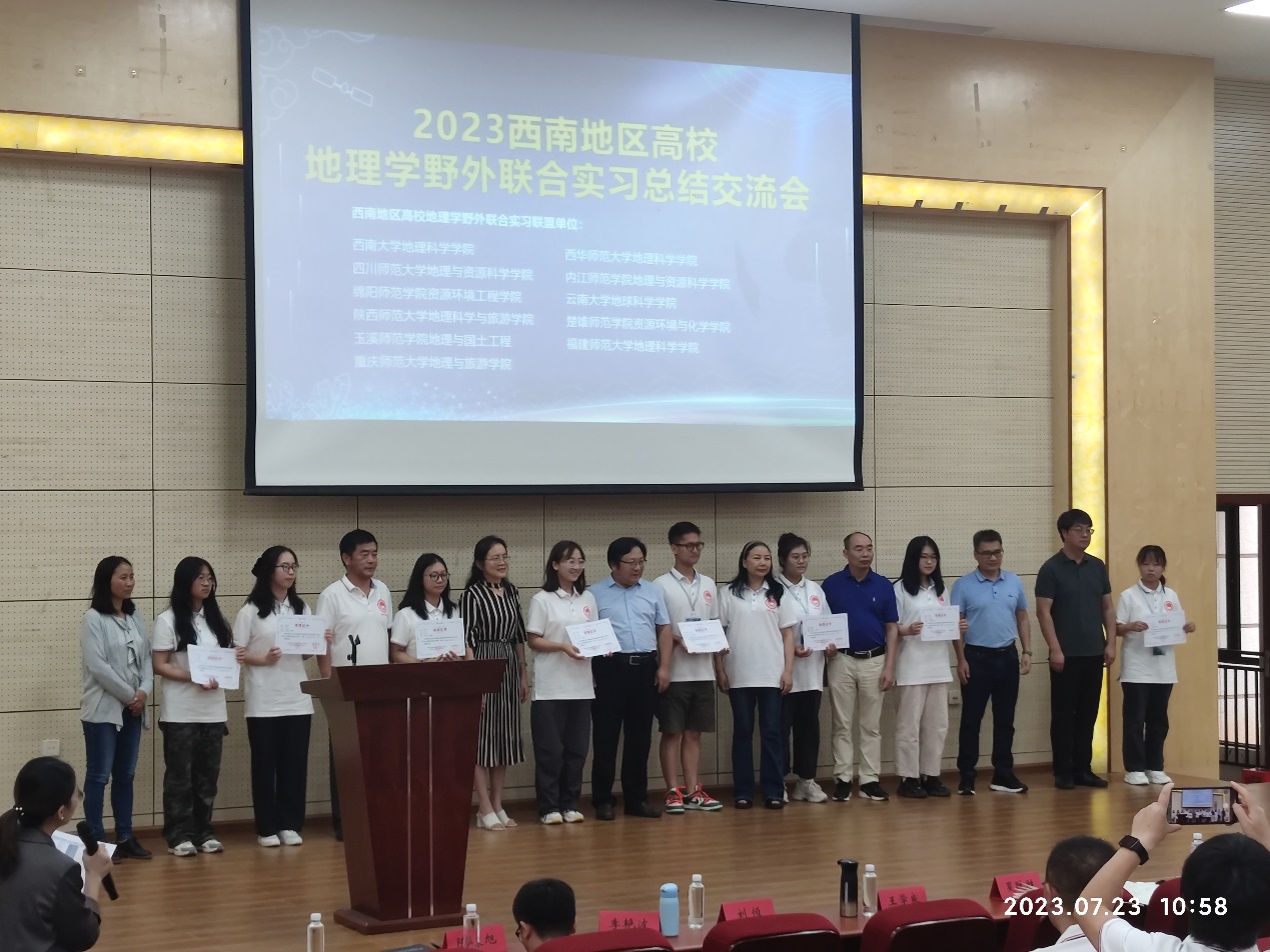 为检验野外联合实习教学效果,体现地理学子的素养,西南地区高校地理学联合野外实习总结交流会于7月23日在云南大学地球科学学院召开,地理与旅游院院长助理张云耀参会。实习汇报环节,地旅学子余训艳、邵蒙、周述琼分别完成汇报《人地共生视角下少数民族传统民居的地理基础与发展——以藏东高原和云南高原为例》、《编制庞大电网,点亮万家灯火——地理学视角下“西电东送”工程发展探究》、《国际整体安全局下南水北调必要性与路径研究——以西线为例》,得到现场评委的认可。除此之外,学院共6人荣获“最佳宣传个人奖”、“最佳基础理论奖”等荣誉奖励。