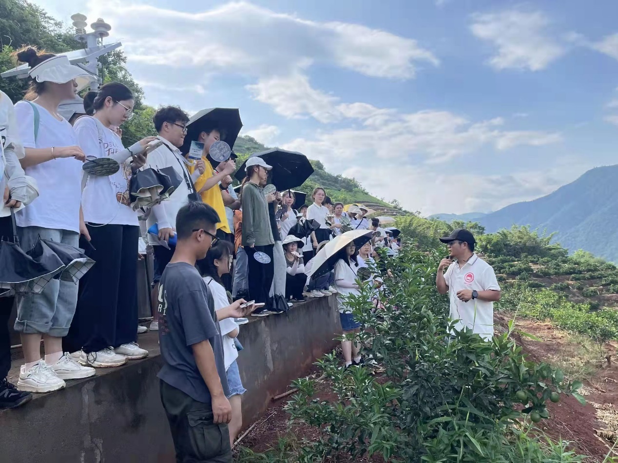 结束嘎洒民族特色小镇的考察,实习队伍到达了元江干热河谷水土保持研究站。虽然一路上满是泥泞,实习队伍仍井然有序的登上了高处,在云南大学老师的带领下,参观坡面侵蚀、沟蚀等自然地理现象,学习了元江干热河谷形成原因、自然环境、及土壤侵蚀状况,并了解了观测站在元江水土保持方面的贡献。同时,老师介绍了柑橘产业扶贫的故事,畅想着干热河谷未来的发展方向。