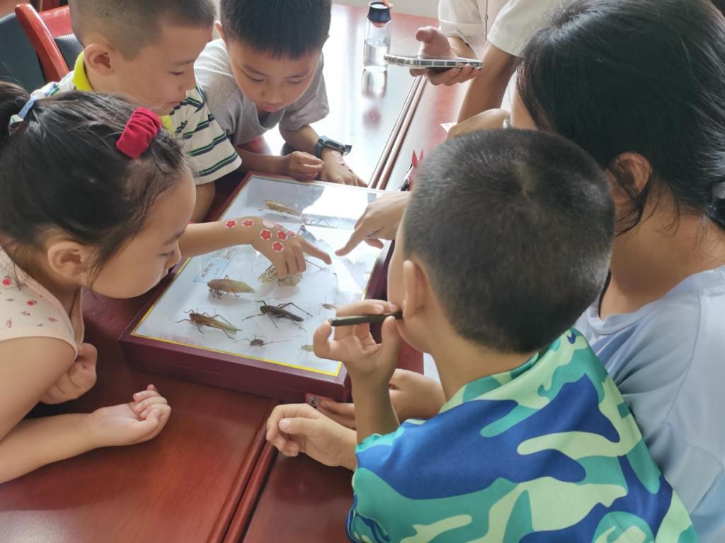 成员和小朋友一起观察昆虫标本