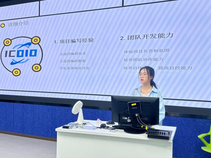 随后,实验室代表刘欣同学为同学们介绍“ICDIO编程夏令营”学习内容、学习机制等内容,鼓励大家参与夏令营、提升个人核心竞争力。最后,“ICDIO学生实践基地”全体成员为2023级同学们答疑。