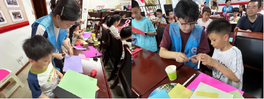 图为队员悉心指导儿童完成“快乐摇摆”和“奔跑的小鸡”手工实验