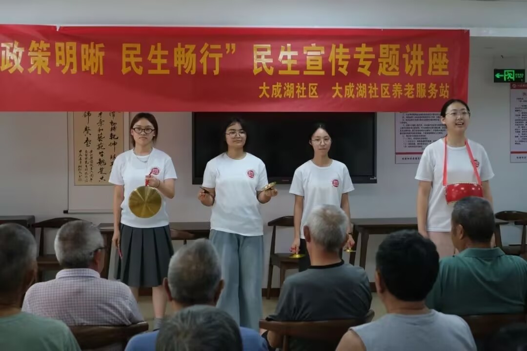 14时,实践团成员分为两组来到太成湖社区养老服务中心与虎溪花园社区养老服务中心开展活动。在养老服务中心,实践团围绕“养老关爱,民生同行”,有序推进网络安全情景剧、民生宣讲、三句半等宣传活动的开展。最后,实践团成员以一首《最炫民族风》的舞蹈告别今日三下乡的整个行程。舞步起落间,青春与岁月在此刻共鸣,既展现了实践团昂扬向上的精神风貌,也承载着对社区居民的真挚祝福,欢声笑语中,这份温暖与感动将成为彼此难忘的回忆,也为后续实践活动的深入开展埋下期待的种子。