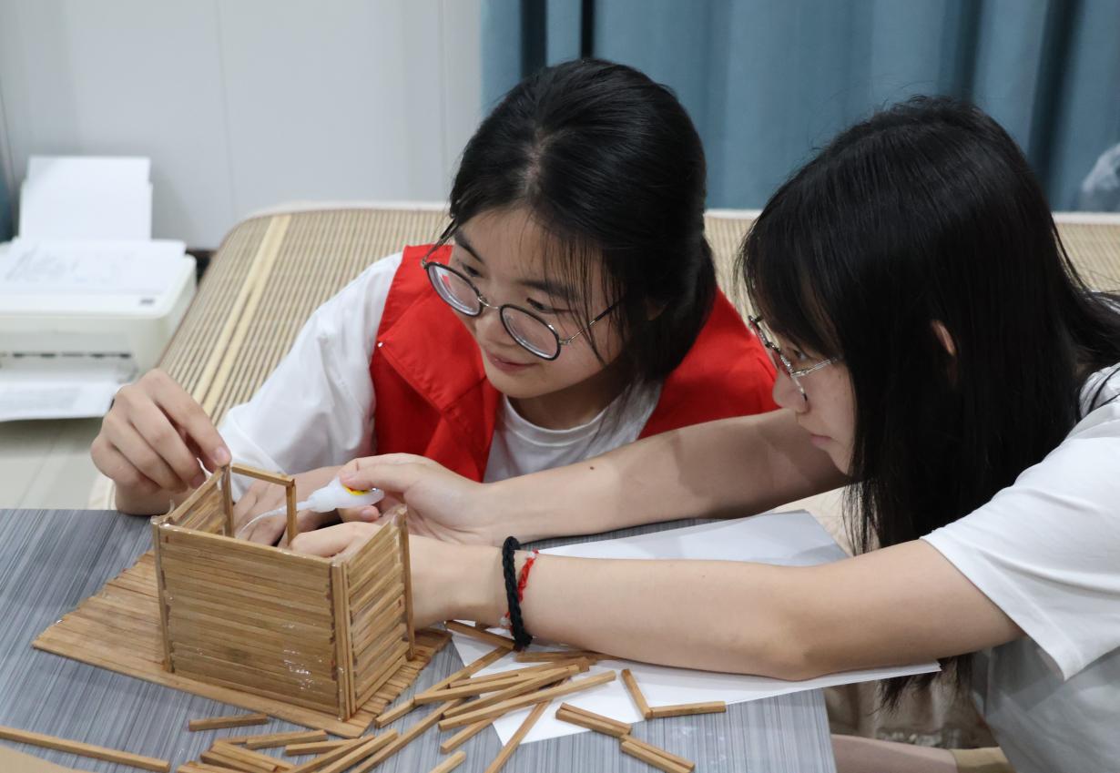 当日上午,实践团成员分工开展活动筹备工作。教学组聚焦龚滩文化核心要素,针对青少年认知特点,系统梳理龚滩历史沿革、土司制度演变等内容,反复打磨教案框架,优化讲解逻辑,力求以通俗易懂的方式呈现文化内涵;教具组专注于吊脚楼模型的组装与调试,参照传统建筑形制,确保模型直观展现吊脚楼“依山而建、临水而居”的建筑智慧与防潮抗震的实用功能,为后续教学奠定坚实基础。