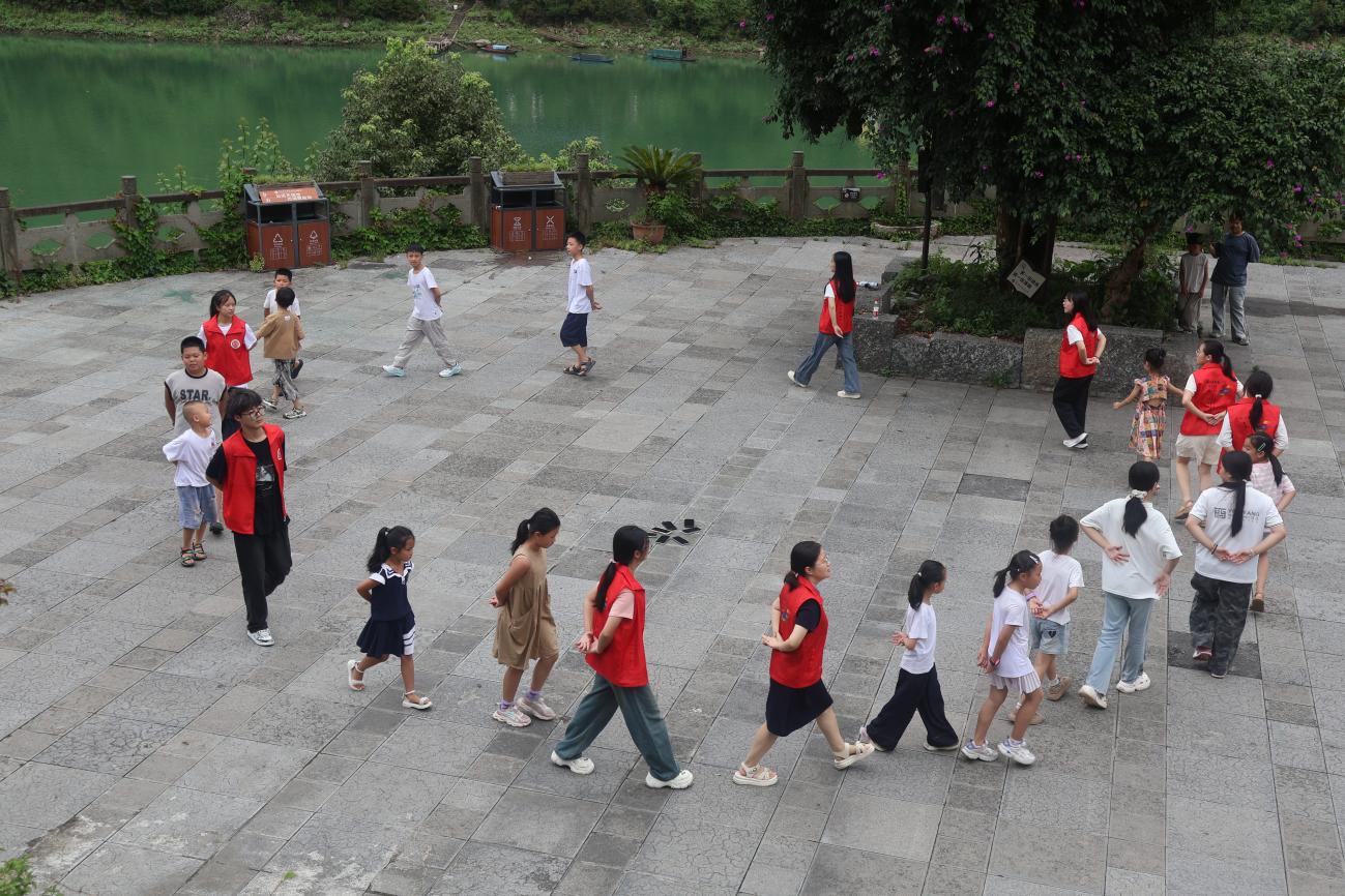 午后,实践团与孩子们移步户外广场,手拉手跳起摆手舞。实践团带领孩子们熟悉步伐、节奏,在欢快舞动中,传递土家族摆手舞承载的历史记忆与团结精神。灿烂的笑容,让非遗“活态传承”魅力尽显,也拉近了孩子们与传统文化的距离。而在共跳摆手舞的过程中,成员自身也完成对传统文化的深度解码。