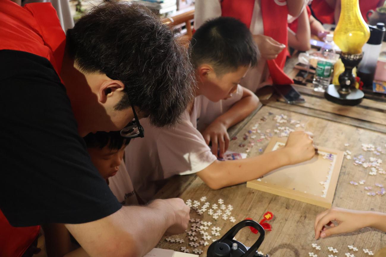 图为实践团成员帮助小朋友完成拼图
