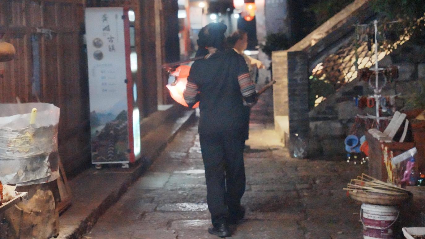 夜幕降临,华灯初上的龚滩古镇褪去白日的喧嚣,更添几分古朴静谧。团队成员特意跟随古镇的打更人,体验了这一延续千年的民俗活动。“天干物燥,小心火烛”,随着打更人手中梆子发出清脆的声响,浑厚悠长的吆喝声在街巷中回荡,仿佛穿越时空,将古镇的夜晚拉回遥远的过去。同学们一边跟着打更人的脚步穿梭在石板路上,一边聆听他讲解打更的历史渊源——从最初的报时、防火防盗,到如今成为承载古镇记忆的文化符号。这一声声梆子响,不仅是时间的刻度,更是古镇生活节奏的延续,让大家在夜色中感受到了传统文化在现代生活中的独特存在形式。