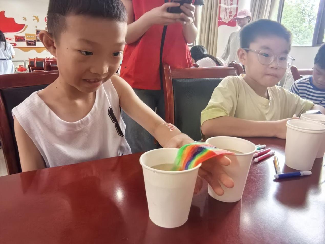 志愿者展示实验材料:两杯清水、彩色纸巾、颜料。一步步演示,将纸巾折叠架在杯上,滴入颜料。随着时间推移,彩色 “桥” 悄然 “流淌”,小朋友们惊叹连连。讲解毛细现象原理,从纸巾纤维到植物吸水,用童趣语言让科学变易懂,知识问答巩固,小朋友们积极抢答,收获满满。