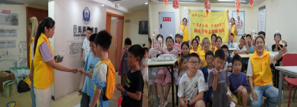 (图成员发放防诈钥匙扣 摄|杨娇)        (图为成员与儿童合影 摄|杨娇)
