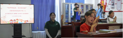 团队首站走进海子沿乡尖山子村红领巾小课堂。首先,团队成员田琪琦主持推普活动,从重庆火锅等特色切入,结合方言与普通话的差异进行导入,引发孩子们的好奇心。随后进行语句断句练习,选用几个多音字句子考察孩子们的普通话掌握情况;组织诗歌朗诵活动,带领孩子们共读经典篇目。接着,团队成员带领孩子们做简单的手势舞。课堂上,孩子们纷纷高举起小手参与问答。孩子们全程双眼紧盯着讲台,主动跟随引导大声朗读、积极互动,展现出对普通话的浓厚兴趣,这一环节通过多样形式让孩子们在欢乐中提升语言能力,更拉近了不同地域文化间的距离。