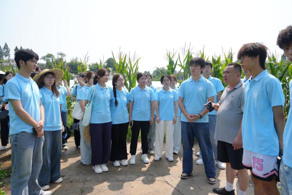 服务队首先走进少云村绿色蔬菜种植基地,开展“研学产业,助力振兴”暑期“三下乡”实践活动,实地探究特色产业发展的创新密码。在基地,少云村党支部书记邱德洪为队员们进行了生动讲解,重点介绍了其严格执行的绿色种植规范,以及村集体探索实践的“国有平台+村集体+经营业主+农户+社会资本”多元融合发展模式。他系统阐述了该模式如何高效整合各方资源,盘活土地等要素,打通产销环节,有效带动了村民持续增收,并鼓励青年学子关注基层实践智慧,理解不同要素在乡村振兴中的创造性结合。