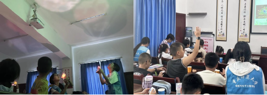 下午两点,“奇妙的光学世界”科普课堂准时开课,这也是此次“三下乡”活动的一大亮点。志愿者们带来了棱镜、平面镜、水杯、手电筒等器材,从孩子们熟悉的“彩虹为什么有七种颜色”“镜子为什么能照出人影”等问题切入,用生动的语言讲解光的反射、折射和色散原理。在实验环节,志愿者手把手教孩子们操作:将去底的水杯装满水,用手机闪光灯从特定角度照射,光线通过水折射到墙面,形成了色彩斑斓的“印象画”;用棱镜让阳光折射出彩虹,让孩子们直观感受光的色散现象。孩子们在亲手操作的过程中,不时发出惊叹声,纷纷举手提问:“为什么水可以让光变成画?”“镜子反射的光为什么和原来的一样?”志愿者们一一耐心解答,现场互动频繁,气氛热烈。通过此次科普课堂,孩子们近距离触摸到科学的魅力,对光学知识的探索热情被充分点燃。