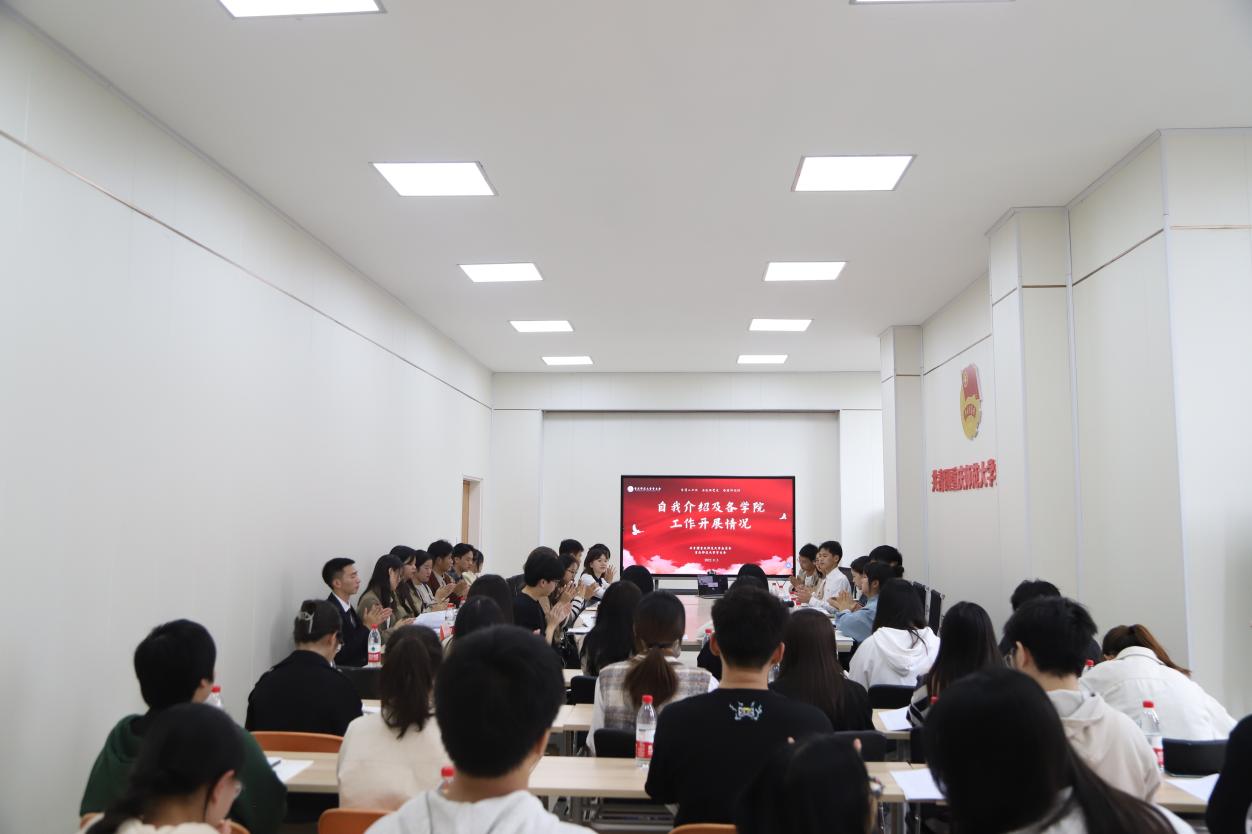 校学生会主席团成员、团工委学生副书记以及各学院参会代表依次进行自我介绍,并对学院学生工作总体情况及学院特色活动进行简要阐述。