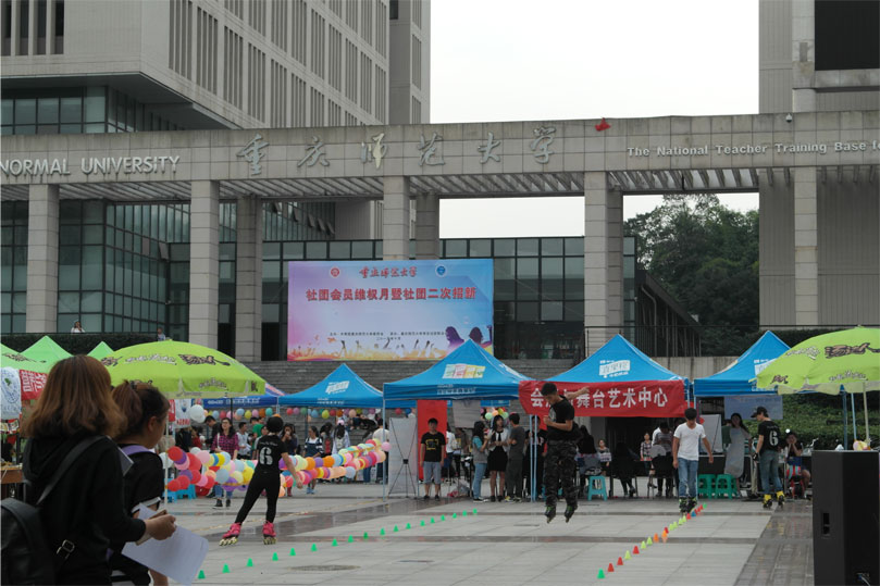 放眼望去,图书馆广场满是人潮,各种社团活动及招新方式让人眼花缭乱。不少同学早已包围场地,沉醉其中。广场中央用气球围绕成一个小型舞台,灵活的身姿在清风中飞舞,伴之以观众的掌声,街舞社成为一道靓丽的风景线。圆滚的滑轮在地上留下条条滑痕,十来个人穿上轮滑鞋,Flyer轮滑社成员轮番展示各种炫酷技巧。而围绕着广场的小舞台分布着各式各样的社团。现场摆放宣传海报,制作小视频,发放小礼物……社团招新方式多姿多彩!创业协会、粤语协会、外语协会、辩论协会、播音联盟协会等各协会厉兵秣马,解答会员维权相关问题并积极进行二次招新。